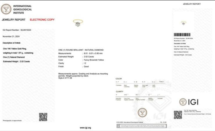 Voeg een uniek stuk luxe toe aan je collectie met deze prachtige damesring van 14 karaat geel goud, gezet met een natuurlijk gekleurde fancy bruine diamant van maar liefst 2,02 karaat. Dit is geen standaard diamant β de steen heeft een bruine fancy kleur met warme ondertoon, wat zorgt voor een zeldzame en stijlvolle uitstraling.